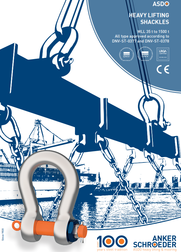 ASDO Heavy lifting shackles with `orange & blue pin‘ are available for both industrial and offshore applications. The safety factor of ASDO shackles is fully assessed by in-house FEA and confirmed by physical testing during DNV Type approval process. ASDO Heavy Lifting Shackles generally comply or exceed design and testing requirements of ASME B30.26-1 and Federal Specification RR-C-271.