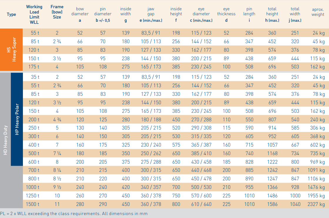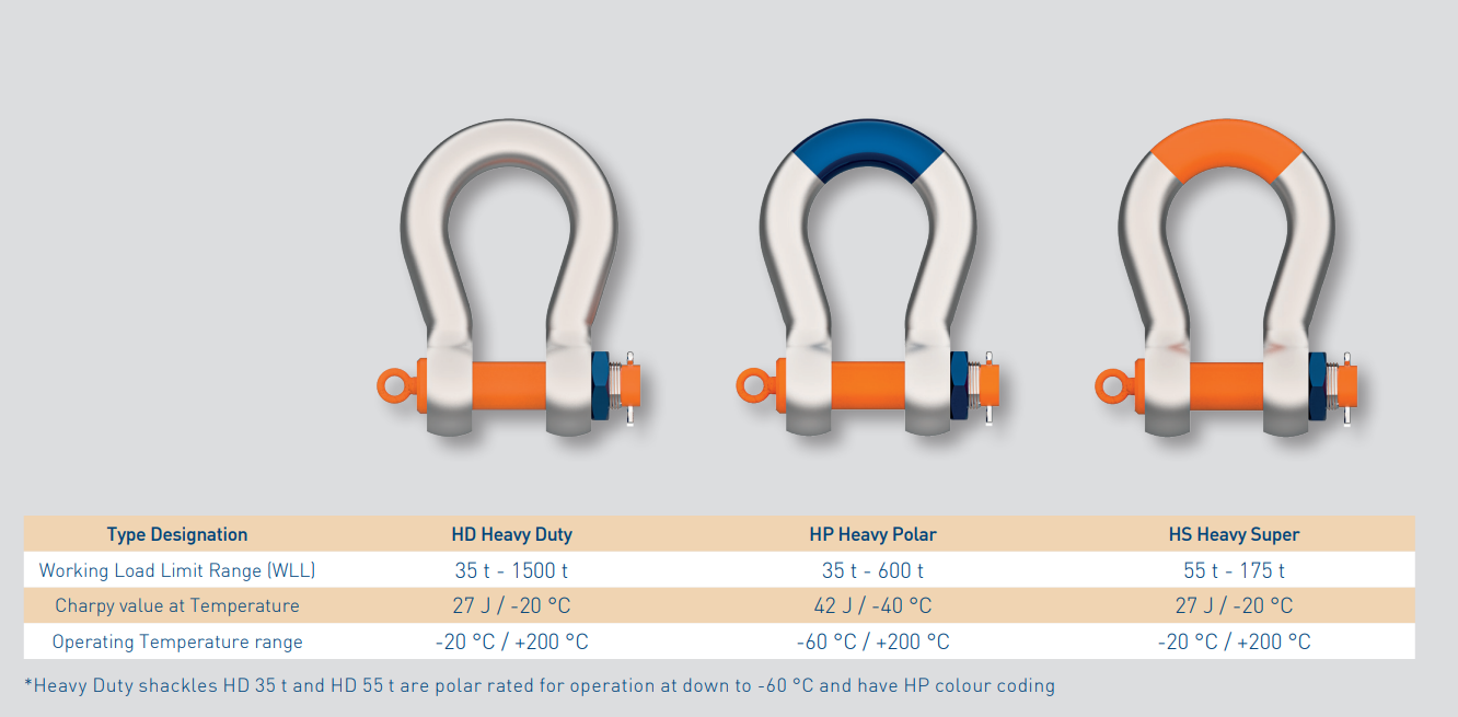 The ASDO standard range of shackles from 85t to 1500t WLL includes Heavy Duty (HD), Heavy Polar (HP) and Heavy Super (HS) shackles.