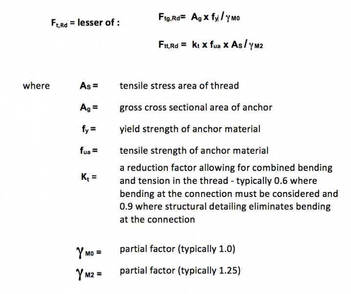 In accordance with EN1993-5 the tensile resistance Ft,Rd of an anchors is calculated as the lesser of the tensile resistance of the thread, Ftt,Rd or the tensile resistance of the shaft, Ftg,Rd at any time during the life of the structure: